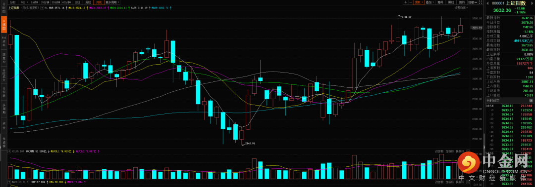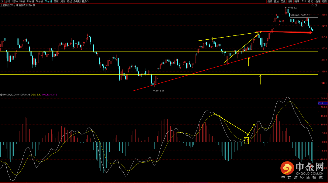 大盘出现跳空向下的扩张下跌,短期注意观察六十分钟的上升趋势线支撑,大概率会在3610到3625附近遇到支撑,而日线则需要关注macd量柱的变化,在没有出现再次的量柱扩张向上之前调整大概率不会结束。注意把控好三买结构后的反弹。