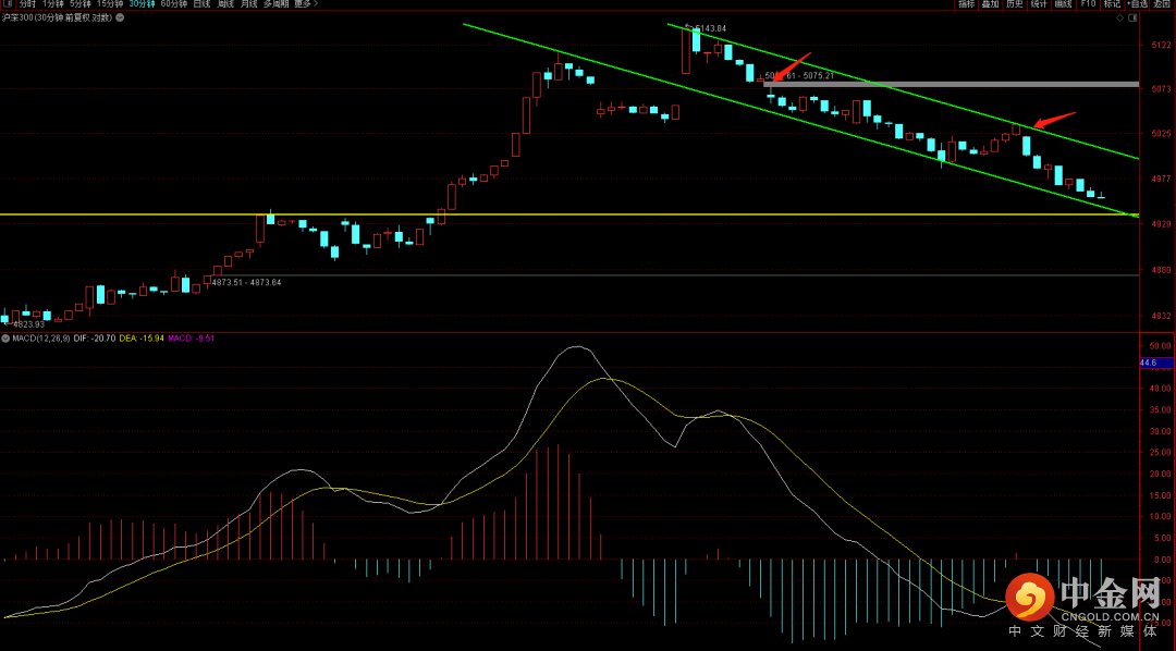 沪深300目前已经进入了小级别的下降趋势,短期在没有突破下降趋势轨道之前大概率会延续下跌,而如果出现跌破下降趋势轨道下轨,则可能出现快速加速赶底下跌。