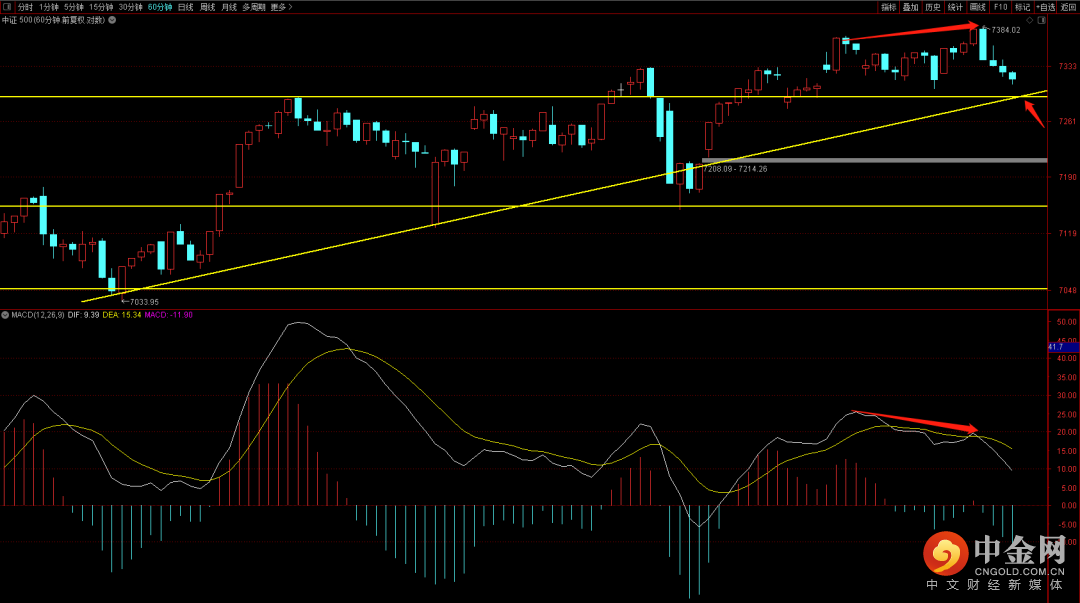 中证500目前出现了六十分钟的顶背驰结构,短期关注六十分钟的上升趋势线是否会再次跌破,如果跌破则需要关注下方的前期缺口,有可能会出现回补走势。