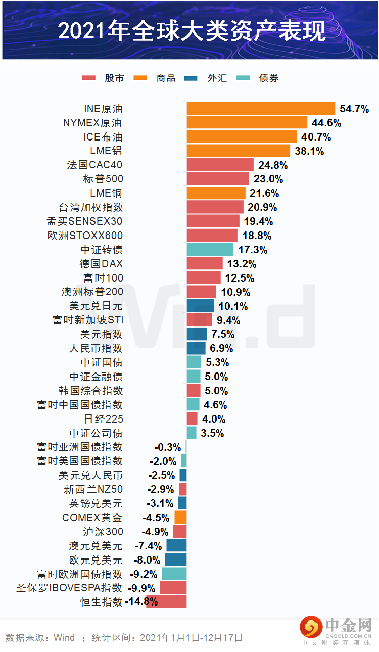 2021年即将结束,今年以来各类资产类别的表现孰优孰劣?2022年各类资产价格又将呈现何种走势?对此,Wind对2021年以来全球主要股市、商品、债券和汇市等大类资产做了一个盘点。