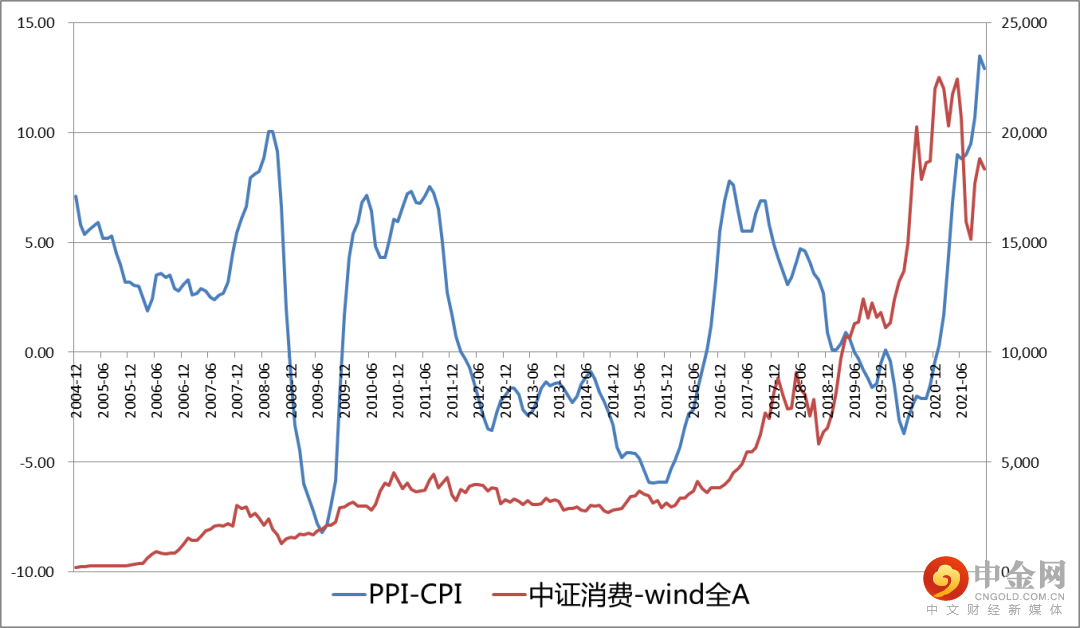 上图为PPI-CPI剪刀差与中证消费指数的走势拟合。2020年10月至2021年10月区间,PPI大幅走高,CPI在小幅攀升后于今年7月开始呈下行趋势,PPI和CPI剪刀差持续扩大。从指数结合的上图可以看出,在PPI-CPI剪刀差回落的几个历史阶段,中证消费指数基本都是有明显超额,尤其2016年12月至2020年5月阶段,消费超额明显。