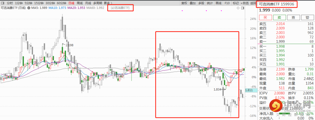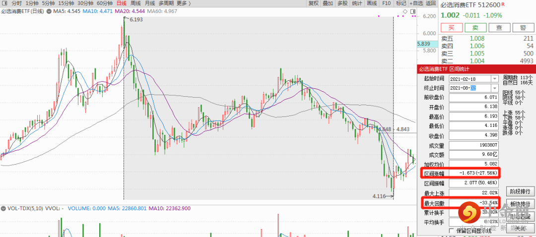 上图是今年年必选消费ETF(512600)和可选消费ETF(159936)的走势情况,从必选消费走势来看,2021年2月18日达到年内最高,而在达到年内最高点后的一个月间(2.18~3.09),净值从6.193跌回4.627,区间涨幅-22.32%;同样的,可选消费也在今年2月底至3月初受到重创,以159936为例,净值从2月18的2.198跌回3月9日的1.889,区间涨幅-11.73%;拉长时间到2021年一整年的表现来看,必选消费512600的年内最低点出现在8月2日,区间涨幅-27.56%,最大回撤超30%;可选消费年内最低点出现在7月28日,区间涨幅-12.99%,最大回撤超15%。