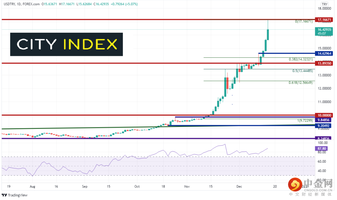 这不是我们第一次讨论美元/土耳其里拉图表,当其击穿10.00时就讨论过。仅仅几周后,该货币对就上涨近70%,最高触及17.1667,后在央行干预下里拉才止住了贬值势头。谁也不知道美元/土耳其里拉的高点在哪里,猜顶也许不是好主意。10月以来RSI一直处于超买区域,没有任何支持其很快回到中性区域的理由。考虑到美元/土耳其里拉的变化速度之快,下个强阻力位要到遥远的心理整数位20.00。但周五高点17.1667是一个小级别阻力位。如果高点就位,下档日图第一支撑位在12月13日高点14.6296,再下方不远处的14.3232是又一支撑,那是11月10日到周五高点行情的38.2%回档位,接着是水平支撑位13.8935、同期行情的50%回档位13.4449。