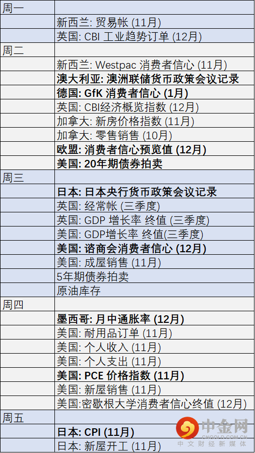 由于大部分国家将要进入假期导致交投时间缩短,大部分数据都已被提前披露。但因为上周宣布货币政策决议的央行太过集中(再次召开会议的时间最早不会早于1月末),这些提前披露的经济数据很多没有引起强烈的反响。后市与通胀相关的数据将是焦点,所以本周更重要的数据将是美国的PCE和日本的CPI。本周需要关注的数据详见下方: