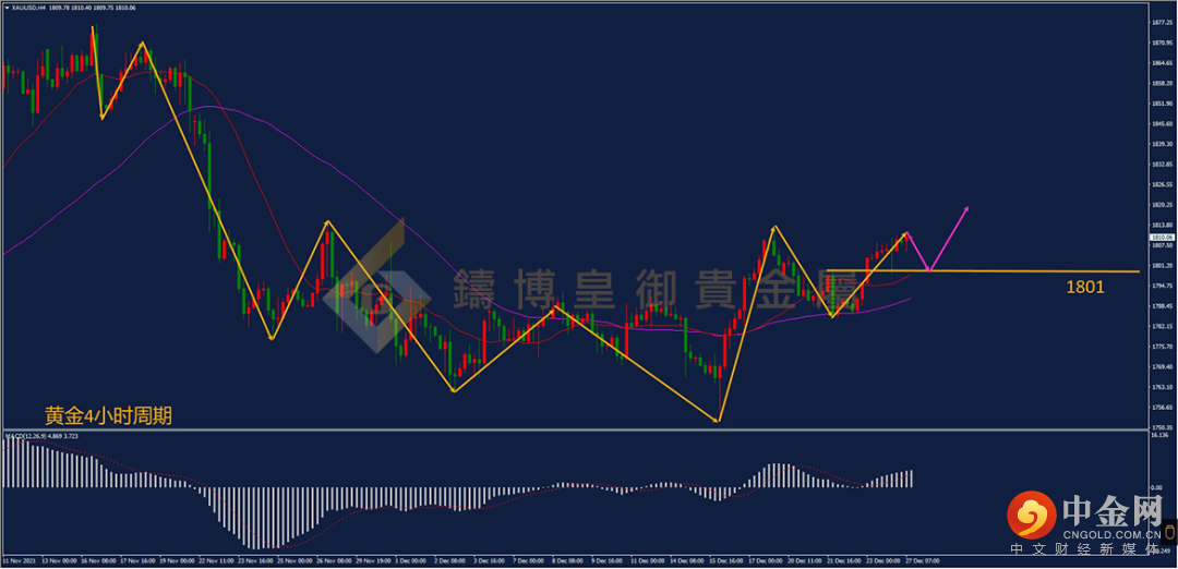 周线级别中,21均线和60均线走平,代表近期的行情是震荡为主,震荡指标KD指标已经出现金叉向上信号,代表做多动能占据上风。日线周期中,21均线和60均线走平,代表日线单边行情未出现。4小时周期,21均线和60均线形成多头排列,代表当下主要方向周期为4小时,KD动能开始逐渐进入高位,形成钝化,多头进入强势状态,建议逢低布局多单为主。1小时周期中,低点不断抬高,高点不断出现,虽然新高后的幅度不大,但低点不断抬高,则是震荡上行的趋势。建议逢低做多为主。