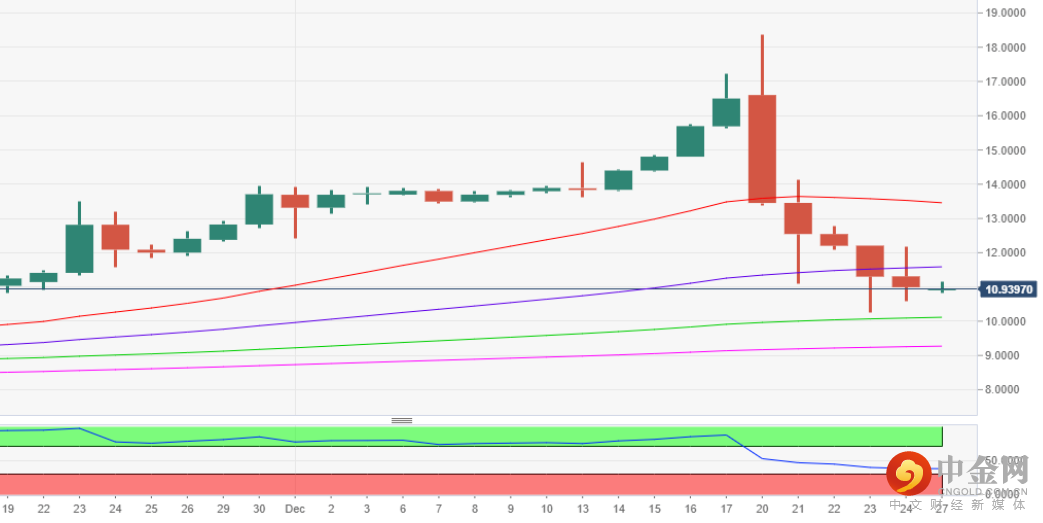 从技术图表看,现货价格守住关键的100日MA均线10.11,这是多头的防线。日内收盘于200日MA均线9.27下方,14天相对强弱指标仍位于中线下方看跌,表明汇价有进一步下跌空间。另一方面,若收复50日MA均线11.59,汇价将进一步反弹指向21日MA均线13.45。