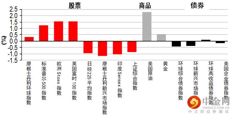 整体美国国库券本周下跌(息率上升),在交投淡静下,跌幅集中在长期国库券,风险承受能力有改善降低了对相对安全的政府债券的需求。整体而言,十年期国库券息率升8个基点至1.49%。