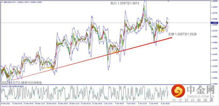 日级别线图,近期在1.3500关口附近震荡,守住5日均线,有望延续涨势;15分钟K线,短线维持盘涨,上升趋势线若守稳,大有可能挑战上方阻力。