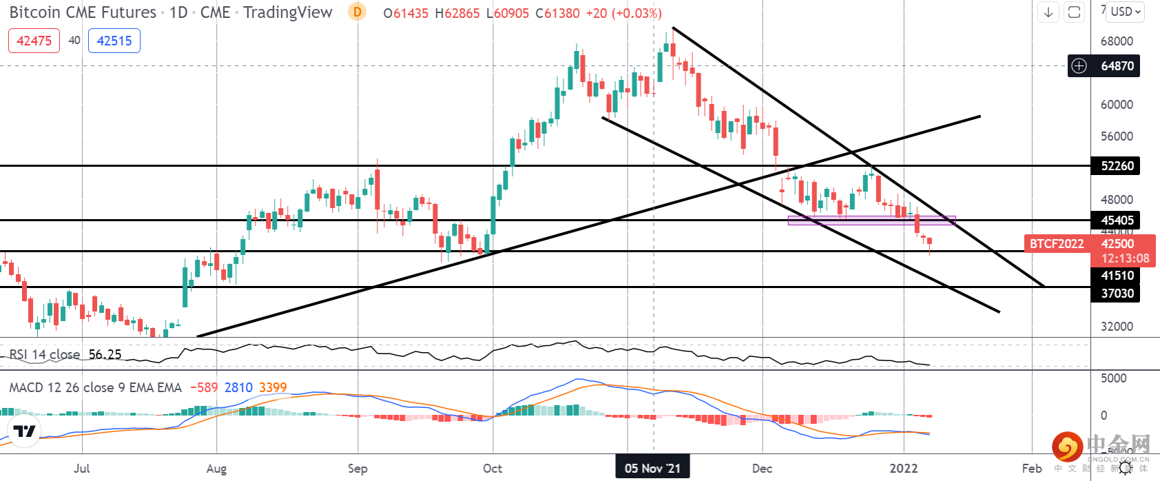低于去年低点的上升趋势线的跌势继续在这里发展。价格现在已跌破 45405 水平支撑并正在测试 41510 水平。虽然 MACD 和 RSI 均看跌,但整体下跌是由下降的楔形图案构成的,这表明不能排除上行逆转的风险。然而,就目前而言,重点是下一步进一步推向 37030。