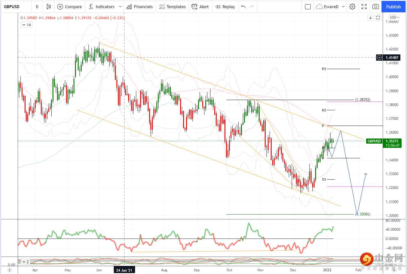GBPUSD 日内偏差:1.36下方看跌,上方看涨。