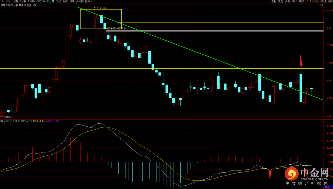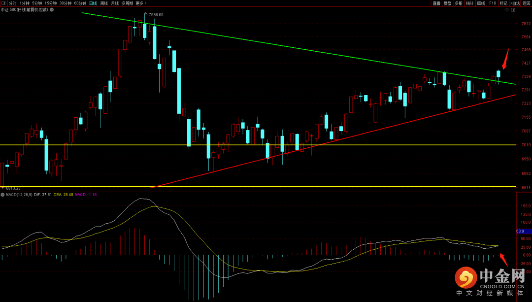 中证500相对强势,短期已经连续两天站上日线下降趋势线,如果周三能够继续维持则后续行情有望沿着六十分钟的上升通道攀升。而短期macd量柱即将翻红,关注翻红量柱的力度。