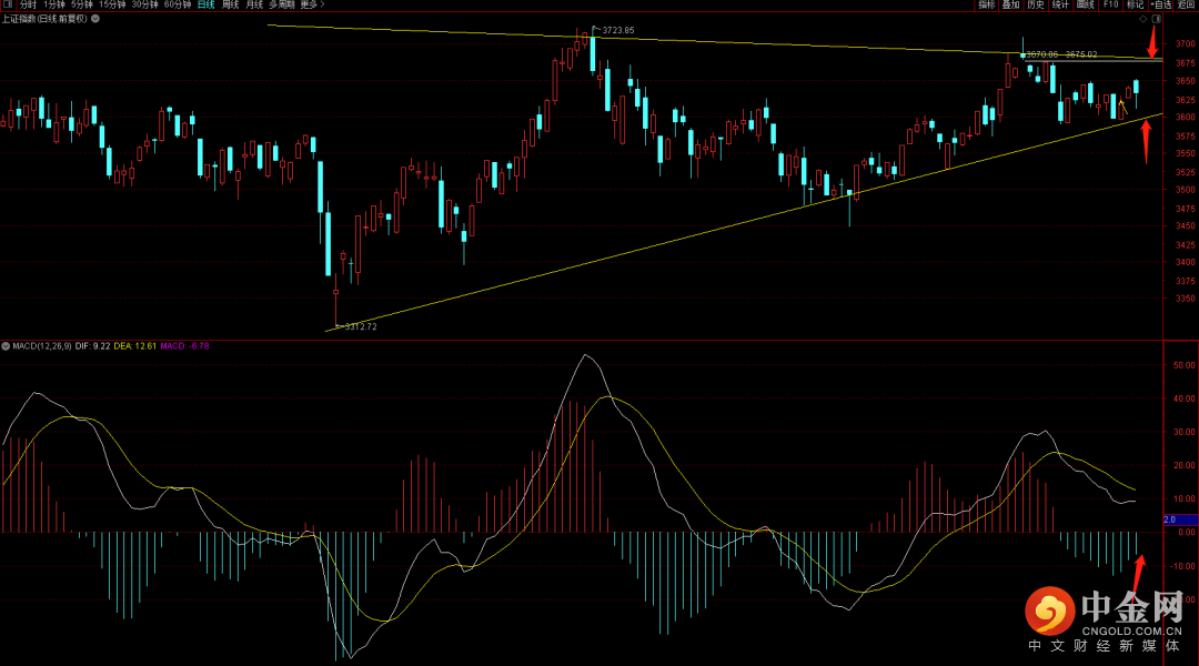 大盘在3650附近遇到压制后出现回落,目前已经回补了前期的跳空缺口,短期这个位置需要重点关注日线macd量柱的变化,在没有出现扩张之前可以谨慎看多,后续在没有突破站稳3650之前大概率维持震荡走势。而一旦站上则有望回补前期的向下跳空缺口。