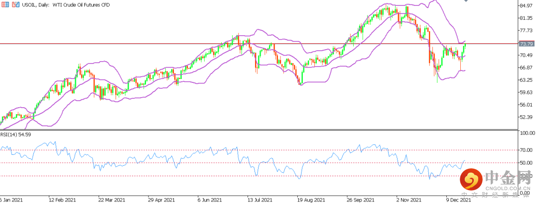 技术方面,WTI原油期货日K线显示,此前RSI指标多次尝试突破50指标线,均未成功,上行压力巨大,但目前已经步入买方区间。布林带目前逐渐开口,有持续上升的趋势。