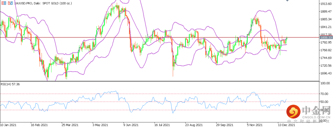 从技术角度来看,黄金兑美元日K线图目前呈现上升趋势。金价近期多为区间波动,布林带上下轨均构成强力阻力与支撑,中轨缓慢运行,目前已突破中轨,并获得有效支撑,布林带有开口趋势,恐加速上行。RSI在50指标线附近运行,目前已步入买方区间。