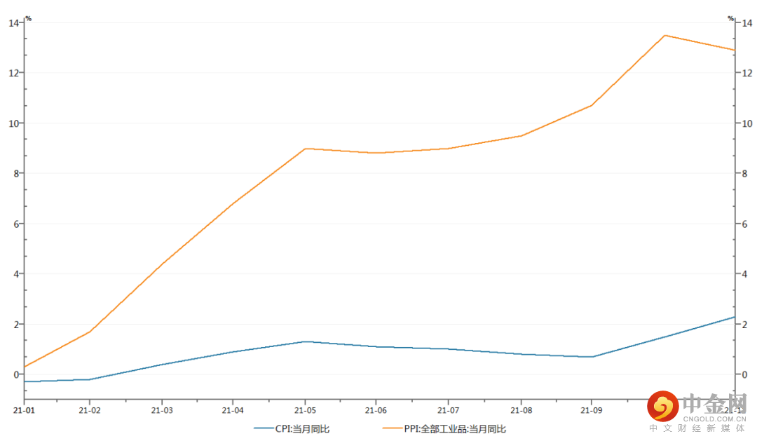 2021年我国PPI呈阶梯型大幅上涨态势,上半年迅速上涨至9%区间后,在9%的平台上维持了4个月,然后再度强势向上,突破10%水平,最高达到13.5%,正是异常火爆。而CPI却截然相反,在整个2021年几乎都十分疲软,一直在1%甚至1%以下区间挣扎,直到年末才重新突破2%水平,几乎如坠冰窖。