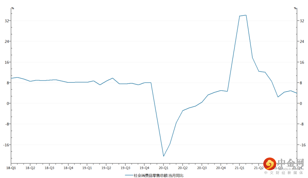 图1-1:2018-2021年社会消费品零售总额同比增速(%)
