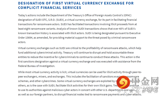美国财政部首度将加密货币交易所纳入制裁 涉嫌为勒索软件黑客洗钱