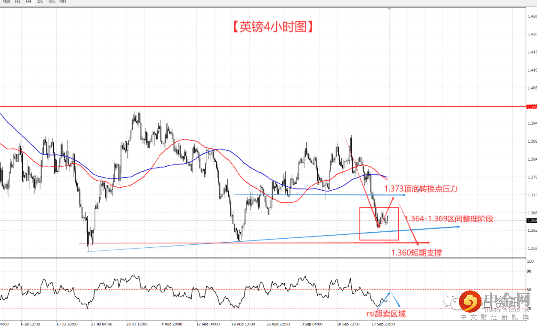 4小时结构的英镑仍处于低点,而且昨天预期的反弹只给到了1.369,随后再次回撤到1.364,足以说明英镑目前的弱势,rsi指标目前仍处于超卖反弹区间,但从目前的这种低位震荡来看,基本就是以低位震荡来修正指标,上方关注修正压力点1.373-1.369,上不去还是继续空,下方回撤关注1.360的支撑,破位就意味着新一轮下跌的开始。