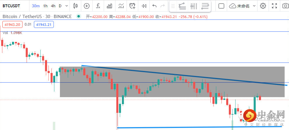 1、价格反弹42500位置进场空单,止损43100,目标看4150;