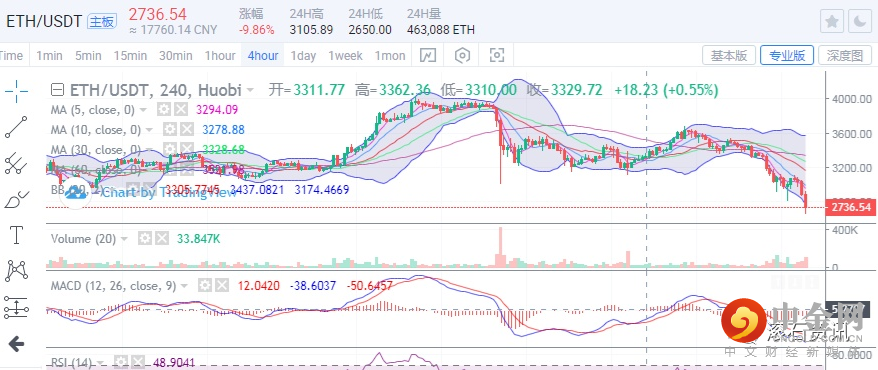 日内跌破3000位置后,最低触及2650附近。目前价格运于2725附近。走势上看,目前以太坊价格仍是维持着下行姿态。4小时图上看,价格持续下行,日内早间价格刺破布林带下轨位置支撑,布林带目前的走势还是延续开口下行姿态。5日均线持续下行,目前运行于2960附近压制价格。附图指标上看,MACD目前于0轴下方持续下探。整体来看,以太坊目前走势就是一个下行姿态,后市的策略上还是建议顺势做空为主,上方关注2900位置压制。