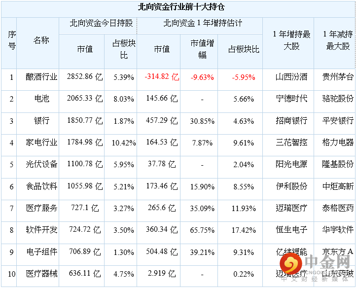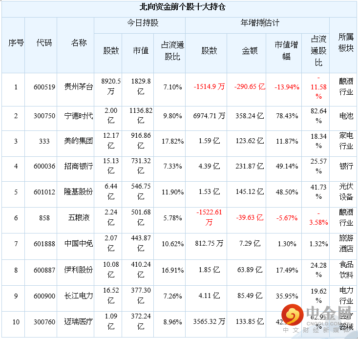 截至2021年末,北向资金十大重仓股份别为,贵州茅台、宁德时代、美的集团、招商银行、隆基股份、五粮液、中国中免、迈瑞医疗、伊利股份、长江电力。其中,隆基股份、迈瑞医疗、伊利股份、长江电力新进入十大重仓股。