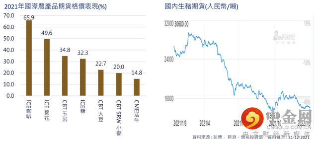 回顾一些国际性主要农产品,明显看到基本上全部都上升,升幅最少的CME活牛期货价格也在2021年上升14.8%。升幅最高的为ICE咖啡,其次为ICE棉花,然后是玉米,分别上升65.9%、49.6%及34.8%。这几类的农产品的平均升幅也能达到3成以上,能支撑整体商品价格表现(图.10)。值得注意的是国内的生猪期货价格在今年反复下跌,国际猪肉期货价格也在年中左右开始出现筑顶回落(图.11)。