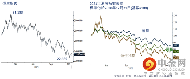 港股去年走势与美股背驰,恒指2月中时高位曾见31,183点,惟下半年跌幅加快,全年底位22,665在12月中出现,全年下跌14.1%。中资股比重较大的国指及科技股占比较多的恒生科指跌幅更大,恒生科指全年跌超30%(图.6及7)。