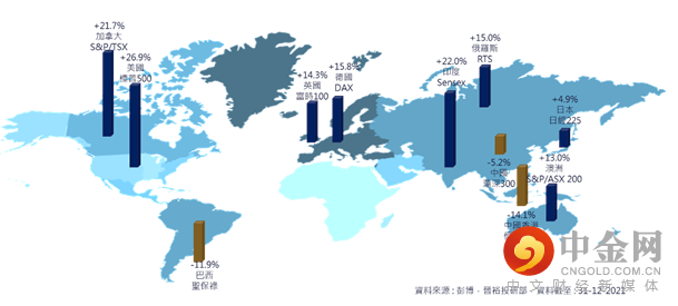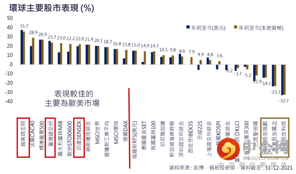 2021年可说是环球股市表现分化较大的一年,若以一些主要经济体计算,欧美地区以及个别新兴市场股指录得不俗的升幅,但部分如中港股市及巴西股市等则录得下跌,形成鲜明对比 (图.1)。