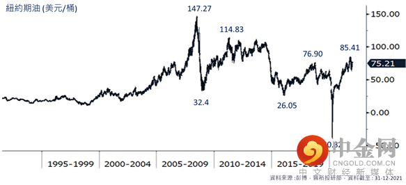 回顾过去30年纽约期油表现,油价的波幅周期一般会维持数年。参考纽油于2008年升至历史高位147.27美元/桶,其后在2009年跌至盘中最低32.4美元,2011年回升至114.83美元,2016年再度跌至26.05美元,然后在2018年升至76.90美元,2020年则发生了不可预料的事情,就是纽油跌穿了零水平,得最低负40.32美元的盘中低位,最新在2021年回升至85.41美元(图.14)。