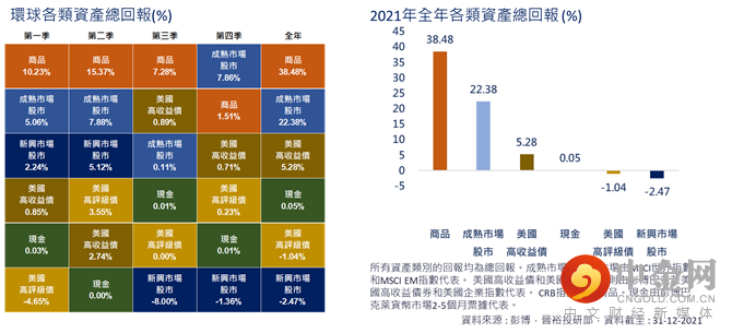 以环球各类资产计算,全年表现最佳的是商品,升38.48%;其次是成熟市场股市,升22.38%;然后是美国高收益债券,全年总回报为5.28%;现金或等值的总回报为0.05%;最后,美国高评级债券及新兴市场股市则分别录得1.04%及2.47%的跌幅(图.8)。
