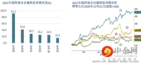 至于金属方面,可分为基本金属及贵金属,两者去年价格走势各异。主要因为需求大幅上升,加上疫情加剧了供应链问题,各类基本金属均在2021年录得显著的升幅,其中LME锡的升幅最高,全年升91.2%。至于工业较常使用的LME铝及铜的的升幅分别是41.8%及25.5%。然而,铝价于第三季的升幅增速再进一步加快,惟在第四季回吐了涨幅(图.18)。