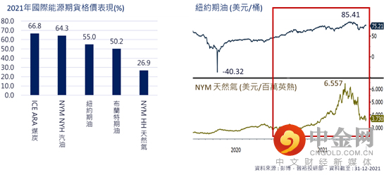 至于能源价格是推动2021年整体商品市场上升的主要推手。去年纽约期油及布兰特期油价格分别大幅上升55.0%及50.2%,约纽期油盘中高位见85.41美元/桶。然而NYM汽油及ICE煤炭升幅更高,分别64.3%及66.8%。尽管NYM天然气全年升幅仅26.9%,但年中价格曾一度升至6.56美元/百万英热的水平,升幅逾120%,惟其后大幅回吐至年底的3.73美元,升幅收窄(图12及13)。