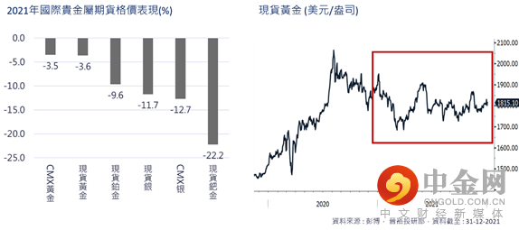有别于基本金属,贵金属在2021年录得下跌。当中包括现货金、银、铂金及钯金4种贵金属分别下跌3.6%、11.7%、9.6%及22.2%。事实上,去年美国债息及美元大幅上行对金价及贵金属带来了压力(图.19及20)。