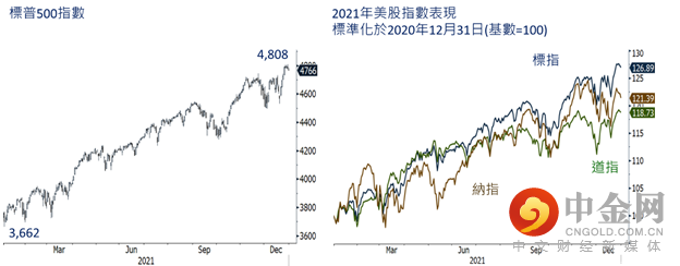 参考标普500指数,指数去年全年持续反复上升,未见出现太大的回调幅度。全年低位3,662点在年头时已见,而高位4,808点则于年底时见。美股三大指数中,标指表现最佳,扭转过去多年纳指最强的趋势;纳指去年表现排第二,而道指则排第三(图.4及5)。