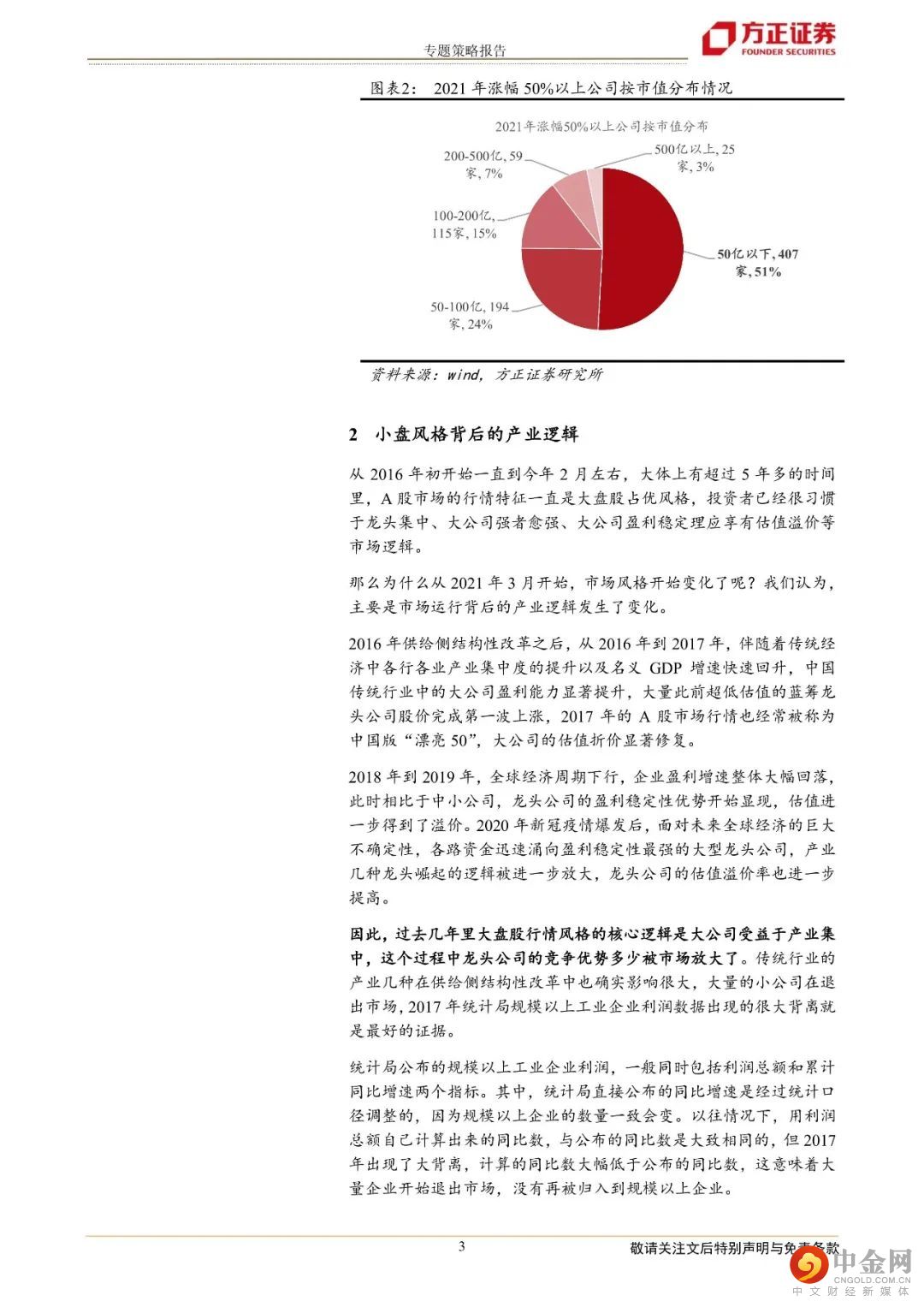 今年以来市场小盘风格明显占优。2021年3月以来,A股市场行情特征一改过去几年的大盘龙头占优风格,呈现出明显的小盘股表现占优特征。主要宽基指数中,涨幅最大的是国证2000指数,中证1000、中证500收益率依次递减均有10%以上涨幅,沪深300和上证50指数收益率为负。个股上看,有800家公司全年累计涨幅超过50%,其中407家公司年初市值在50亿元以下占比超过一半。