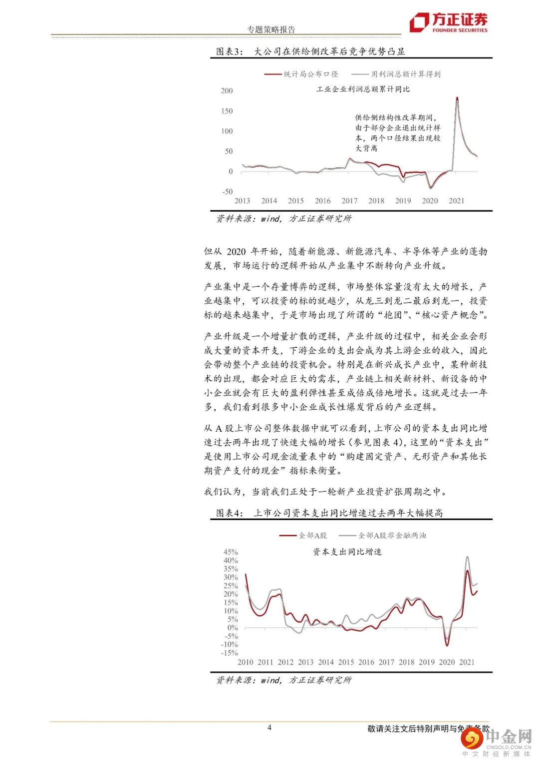 小盘风格背后的产业逻辑。我们认为出现大小盘风格切换的主要原因,是市场运行背后的产业逻辑从产业集中转向了产业升级。过去几年大盘股行情的核心逻辑是产业集中,这是一个存量博弈逻辑,龙头公司提升的市场份额是其他企业失去的,所以产业越集中,投资的标的也越少。而在以新能源、新能源汽车、半导体等为代表的新兴产业中,产业升级会形成大量的资本支出,你的支出是我的收入,这是一个扩散的逻辑,因此投资标的范围会越来越大。从数据中可以清晰地看到,过去两年A股上市公司整体资本开支同比增速大幅提高。