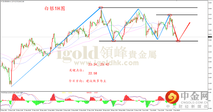 从上图白银1小时周期图来看,白银最近的走势也偏震荡,因为高点和低点的排列规律不符合趋势性特征,故当前可以继续把白银走势当做震荡行情来看待,其中震荡区间大致位于22.58-23.42。从均线上来看,白银也被图中的三条关键均线反复穿越,这也表明白银在1小时图上不处于趋势行情中。上图中用3条水平线分别画出了白银目前的1个关键支撑位和2个关键压力位,由于白银目前的价格靠近支撑位,故预计日内白银将在图中的支撑位附近企稳并转而上涨,因而日内操作建议逢低做多。