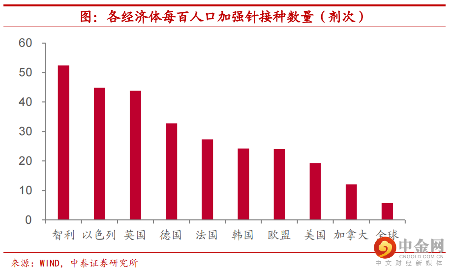 预判二:全球疫情难以消退。近期Omicron变异毒株引发全球疫情再度抬头,其传播非常迅速,而抵御有赖于加强针的推广普及。目前来看,全球接种加强针数量远达不到控制疫情蔓延的程度,短期疫情难以消退。