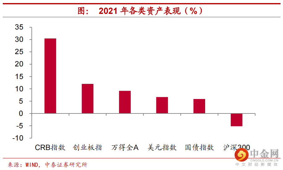 通胀上行,央行未动。2021年资本市场收官,其中以商品价格涨幅最为可观,CRB指数上升幅度30%左右,而国内股债也均有正收益,创业板指涨幅也超过10%,中债国债指数上涨接近6%,唯独沪深300指数表现不佳,全年以-5%左右的涨幅垫底。之所以2021年多数资产价格均有上涨,根本上来说,还是由于主要经济体央行并未对通胀上行有所动作,货币政策保持宽松取向,这也使得中小盘和成长风格相对占优。
