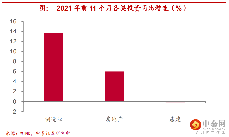 从2021年各类投资表现上来看,制造业投资最为突出,前11个月同比增速超过10%,地产投资增速前高后低,前11个月也在6%左右,而基建投资表现不佳,前11个月投资规模基本与2020年同期持平。投资增速的差异反映出的是经济结构的转变,全社会杠杆率约束愈发增强的当下,依赖举债扩张的地产和基建投资高增长越来越难以为继。即便在中央经济工作会议召开后,对于地产和基建释放了相较之前更为积极的政策信号,但我们预计,2022年全年这两类投资增速很难有明显走强。