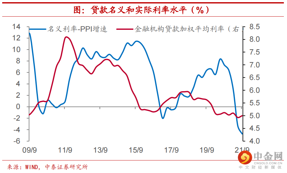 存在降息可能,宽松进程未止。2021年三季度央行全面降准的实施,标志着本轮货币政策宽松周期的开启,而我们预计,2022年仍有进一步降准乃至降息的可能,货币宽松周期未完。由于此前PPI同比增速大幅上行,加上贷款加权平均利率稳中趋降,实际贷款利率有所走低,但三季度贷款加权平均利率已有所回升,而PPI增速也已经见顶回落,实际贷款利率趋于上移。因此,从必要性上来看,实际贷款利率的触底反弹加剧了企业融资负担,调低名义利率水平无疑有助于增强企业的投资意愿。