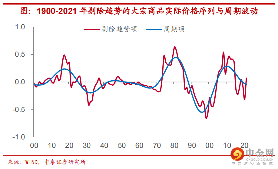 全球大宗商品实际价格仍处下行周期。新冠疫情爆发以来,大宗商品价格在这两年间经历了“过山车式”的走势,让人们由“爱答不理”到“高攀不起”。2021年各类大宗商品价格的轮番上涨,也使得市场纷纷议论新一轮价格上行周期的开启。但通过对百年多来40种大宗商品实际价格走势的综合分析,我们发现,事实上,即便考虑到2021年大宗商品价格的显著上涨,全球大宗商品实际价格仍处于周期下行期,按照30-35年的周期时间来估计,下一次价格低点很可能出现在2026年左右,距当前还有约四五年的时间,之后实际价格上行周期才会开启。
