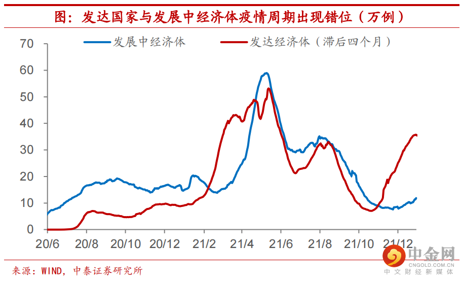 疫情周期错位,很难快速消解。近期Omicron变异毒株引发全球疫情再度抬头,由于其较强的传染能力,病毒在各国传播速度很快,短短一个多月的时间就已经覆盖到超过100个国家和地区,并且范围仍在扩大。最近一周,全球新冠新增确诊病例数量环比上升速度超过20%,尤其是以欧美为代表的发达经济体疫情态势更为严峻,新增确诊病例数量显著上升。我们发现,从新冠疫情爆发后在全球的演化特征来看,发达经济体和发展中经济体存在着疫情周期错位的现象。通常来说,发达经济体疫情要领先于发展中经济体一到两个季度左右,据此来看,今年上半年全球疫情恐难显著消解。
