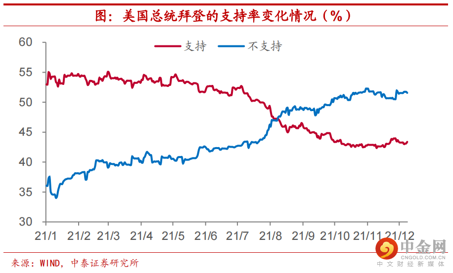 支持率下降显著,议员纷纷退出。美国总统拜登的支持率自2021年年中以来已经出现明显下滑,目前已经从年初的接近53%下降至不足44%,一年时间下滑接近10个百分点。虽然看起来好于前任特朗普执政首年的表现,但根据盖洛普的统计,其支持率的下降幅度超过了二战以来的所有美国总统。此外,民主党宣布退出的议员数量或也将超过共和党,这对民主党国会席位的维持也颇为不利。据The Hills报道,有23名民主党籍国会议员已表态不会争取连任选择退休,共和党方面则仅有13位国会议员声明退休。