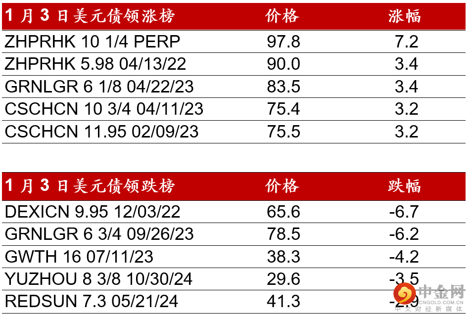 昨日(1月3日),高收益债券市场交投较节前有所回暖,尤其上午交投比较活跃。地产板块债券表现相对分化,世茂、融创等债券上午一度上涨1-2pts,但受市场卖压影响全日仅微涨0.5-1pts,而其他债券如禹州、德信、弘阳等依然呈下跌走势,全日下跌约2pts。此外,正荣债券受先前获批利好消息刺激整体走高2-3pts,而旭辉债券在增发1.5亿26年到期美元票据后整体下行约1pt。其他工业板块高收益债券如西部水泥和中国宏桥等有少量买入需求。