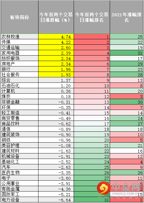 1月4日、5日涨幅居前的板块为农林牧渔、传媒、交通运输、家用电器、纺织服饰、房地产、银行等,这些板块,无一例外,是2021年涨幅靠后甚至是整体下跌的板块。