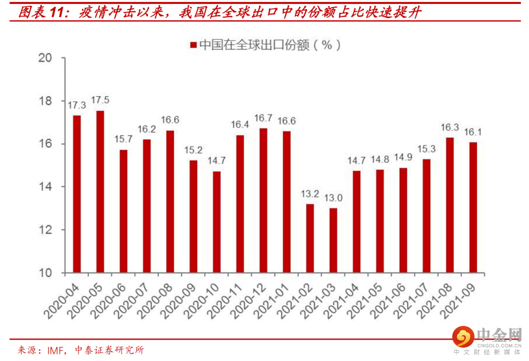 然而,在疫情爆发已经2年多,新型病毒越来越向着“高传染力、低重症率”演化下,至少单纯就经济本身而言,全球各经济体对“疫情常态化”的适应程度所扮演的权重越来越重要:2021年6月后,我国出口占全球份额实际上已回到14%,这一疫情之前的水平。