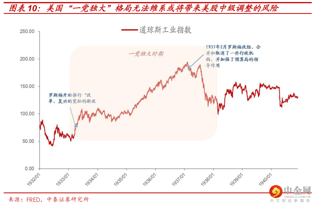 3)以史为鉴,一旦这种“一党独大”格局无法维系,或将带来美股中级调整的风险:2016年底-2018年,特朗普时期“一党独大”“减税再通胀”行情的终结源于2018年10月其中期选举丢掉众议院,市场预期其无法实施新的减税计划;1932-35年,罗斯福“一党独大”下废除金本位+大基建牛市的终结源于其在1935年10月因激进改革而促使国会形成其反对力量占多数的“保守派同盟”,其后续所有经济计划无法通过;