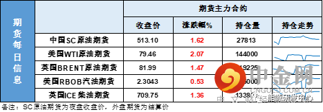【1】WTI主力原油期货收涨1.61美元,涨幅2.07%,报79.46美元/桶;布伦特主力原油期货收涨1.19美元,涨幅1.47%,报81.99美元/桶;INE原油期货收涨1.62%,报513.1元。