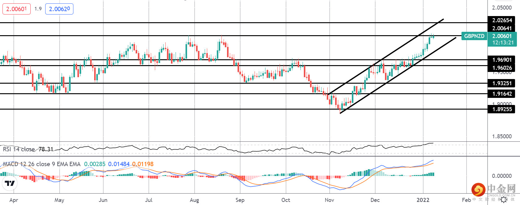 英镑兑纽元自 1.9690 的突破交易现已触及目标 2.0064。 由于零售市场仍然坚定地做空该货币对,并且 MACD 和 RSI 都看涨,这里还有继续走高的空间。 然而,鉴于最近的走势和当前在阻力区域的停滞,预计会有一些修正。 对于那些希望在多头通道保持多头的人来说,2.0265 水平是多头的下一个上行目标。